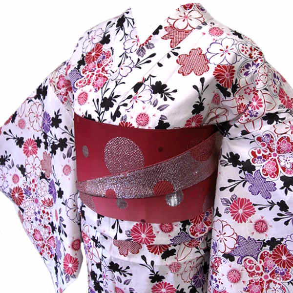 着物美人 送料無料 浴衣 2点セット 綿麻 変り織り 女浴衣 浴衣女性 半幅帯赤 浴衣帯 帯付き 浴衣セット 綿麻浴衣 綿麻着物 街着 大人 女性用 M F L 155-165 【 白 花古典 】R443306