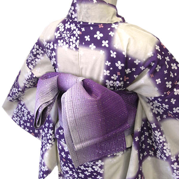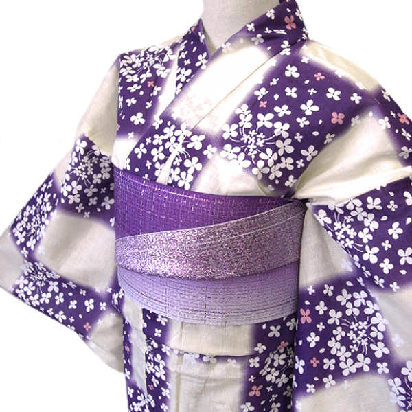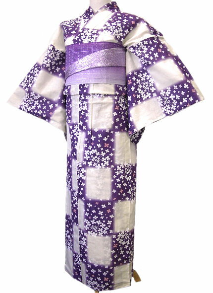 着物美人 送料無料 浴衣 3点セット 綿麻 変り織り 女浴衣 浴衣女性 半幅帯紫 浴衣帯 下駄付き 浴衣セット 街着 大人 女性用 M F L 156-168 【 生成 紫 市松 】R449018