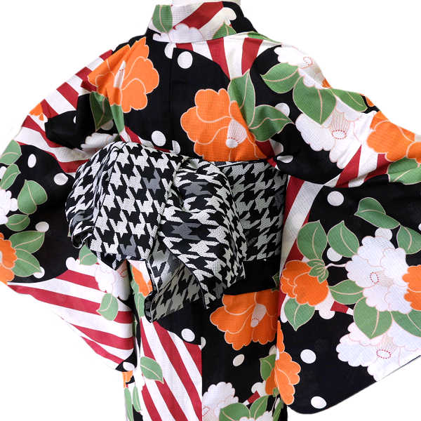 【SALE】半額【50%OFF】【送料無料】即日発送【浴衣&作り帯セット】ジュニア 女の子 綿紅梅 浴衣【椿】150 おしゃれ♪かわいい♪黒 ピンク クリーム 古典柄 花 レトロ 日本製 生地 染 セット 女児 ガール ジュニア 中学生 学校 夏祭り 発表会 衣装 簡単